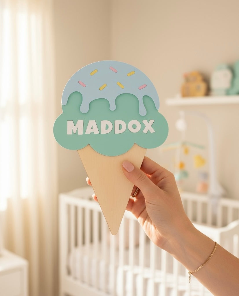 Transform your little one's room into a sweet sanctuary with this playful ice cream name design! Crafted from quality hoop pine plywood and acrylic, this one-of-a-kind wall art features a charming 3D effect that brings personality to any nursery or bedroom.